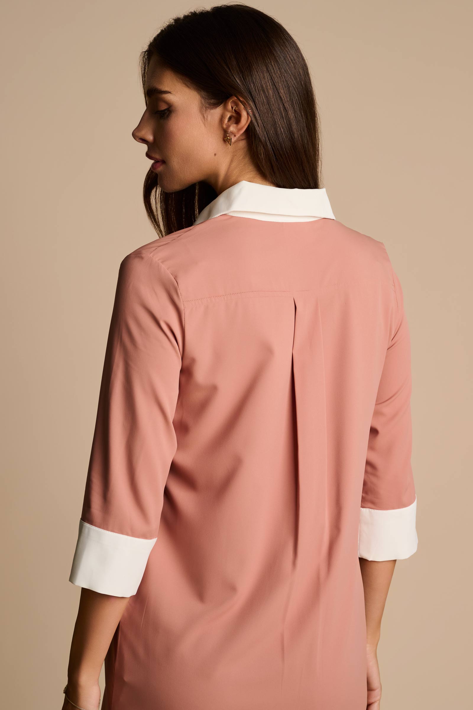 This easy-fit mini dress features a flattering A-line silhouette with a collared V-neckline and a half-length three-button placket, finished with mother-of-pearl buttons. The three-quarter length sleeves with banded cuffs add breezy elegance, while side slits, a contrast hem, and discreet side pockets offer both movement and functionality.