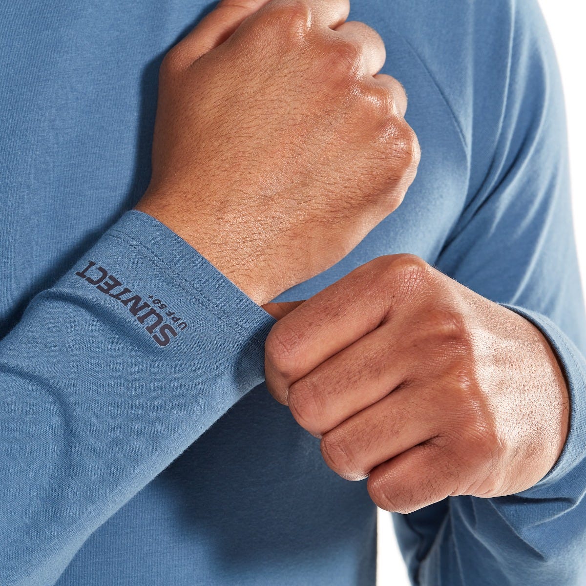 Lightweight and breathable, our Contractor Tee is custom spec'd for the job. Crew neck with relaxed fit styling, this top seller is a super soft blend of UV-ray fighting cotton jersey and flex-stretch that stands up to the sun, heat, sweat, stink and daily rigor while keeping you cool, dry, comfortable and sun safe all day long. Raglan shoulders offer full range of motion and a relaxed long sleeve encourages air circulation to keep skin temps from rising on hot days and provides full UV coverage. A longer body length lets you reach high without exposing skin. Guaranteed to block 98% of UVA/UVB rays.