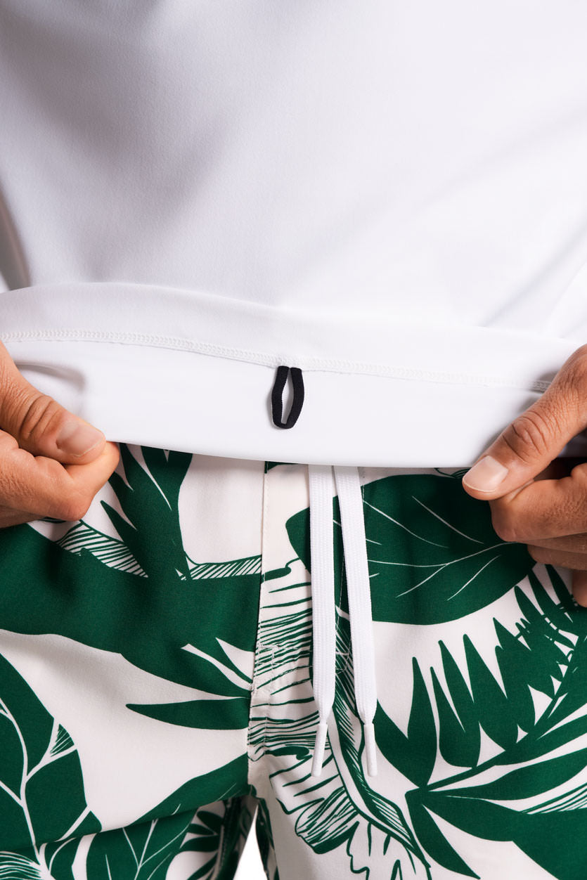 Take on the salt, water, chlorine, and more with our Hightide Short Sleeve Swim Shirt. This men's swim shirt is designed to stay in place with a loop inside the front hem that attaches to swim trunks and gripper elastic at the back hem to prevent the shirt from riding up. A back zip pocket offers a place to stash a card or keys.