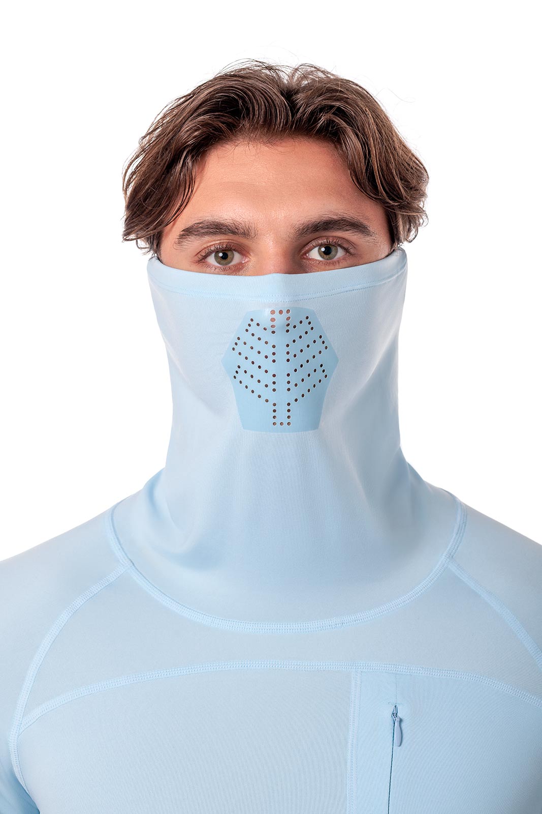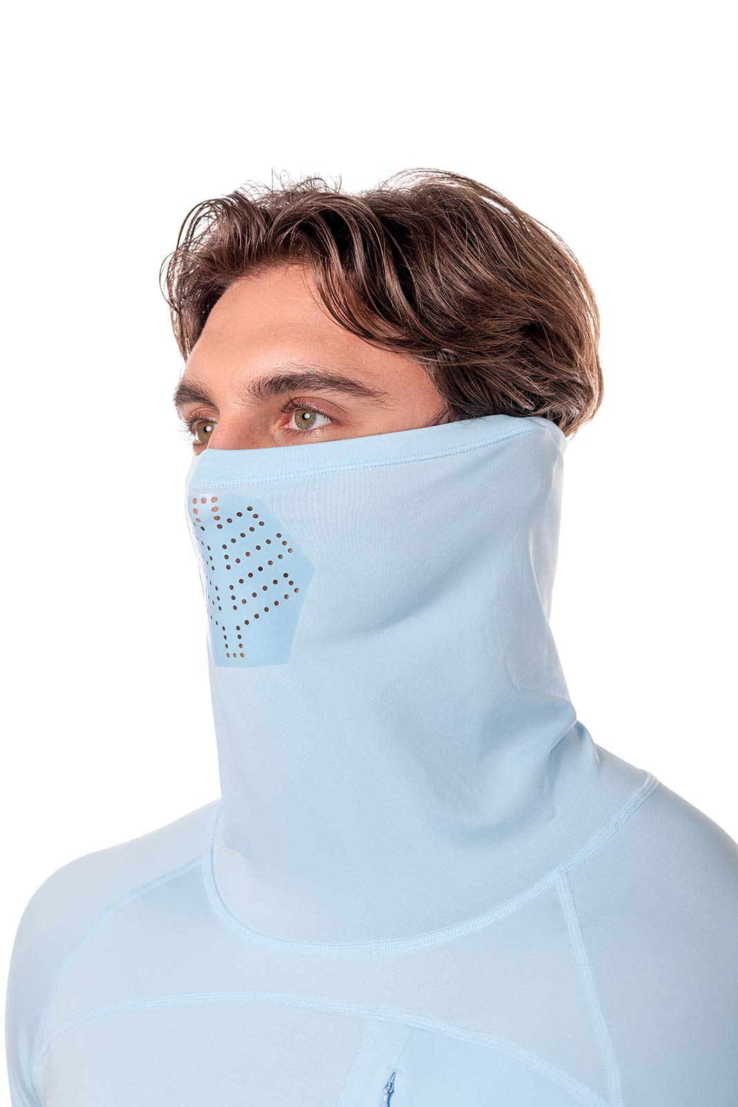 Laser-cut breathability holes in face gaiter for ultimate face coverage and reduced lens fogging