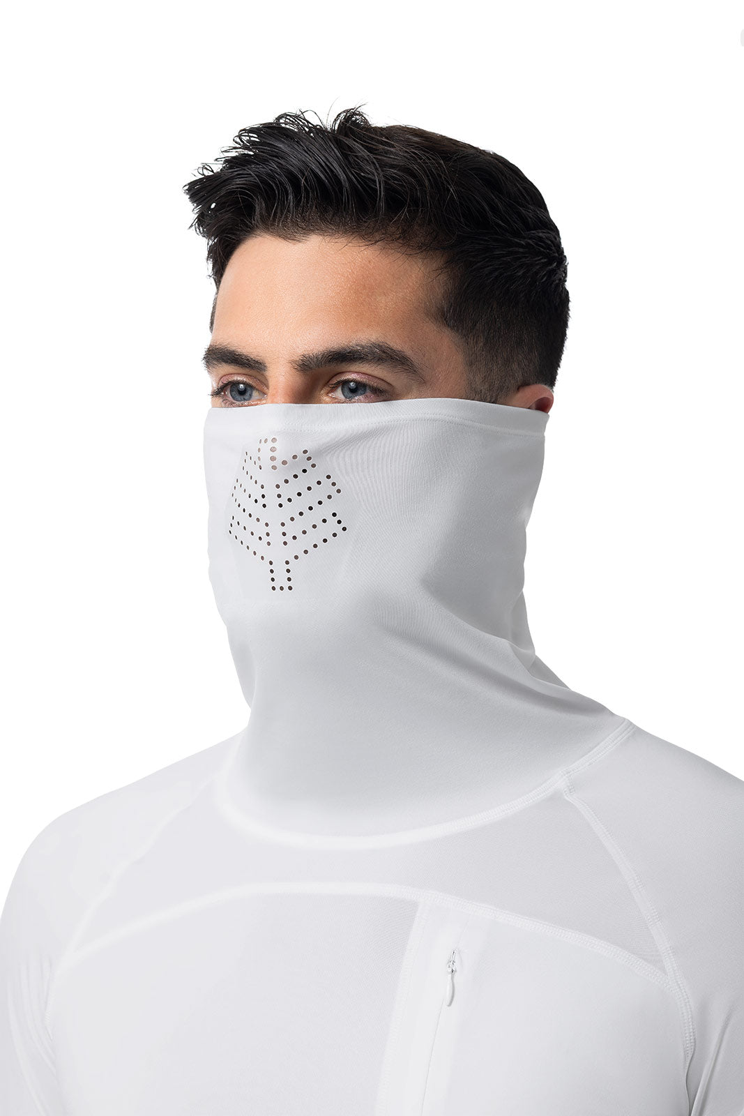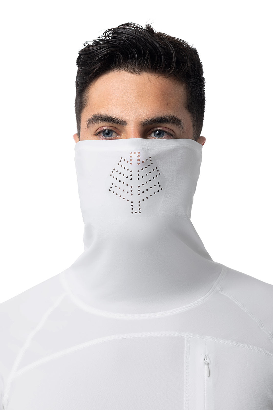 Laser-cut breathability holes in face gaiter for ultimate face coverage and reduced lens fogging