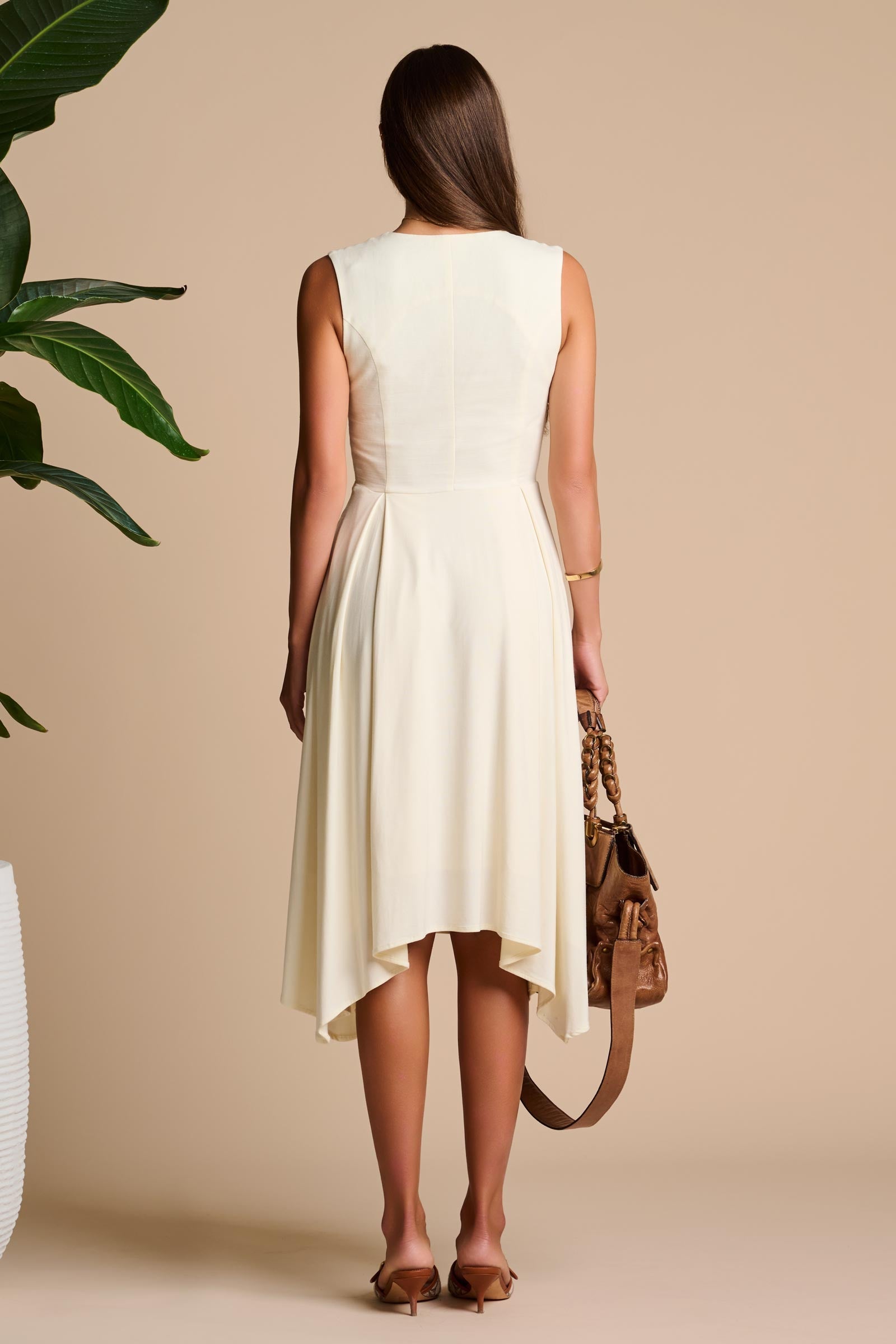Experience effortless sun-safe elegance with the UPF50+ Monroe Dress from the exclusive Coolibar X Mott50 drop. Inspired by the best-selling Mott50 Ballerina Dress, this ivory-colored dress combines sophistication with sun protection. The Cotton Linen Blend bodice and buttery, stretchy UPF50+ Moduri fabric skirt offer a luxurious combination. With a low V-Neck, golden Mother of Pearl button fastening, concealed side zipper, and inner lining, the Monroe Dress is the epitome of elegance. Pair it with the Melbourne Shawl for an extra layer of sun protection. Experience fashion, sophistication, and UPF50+ sun safety in every detail.