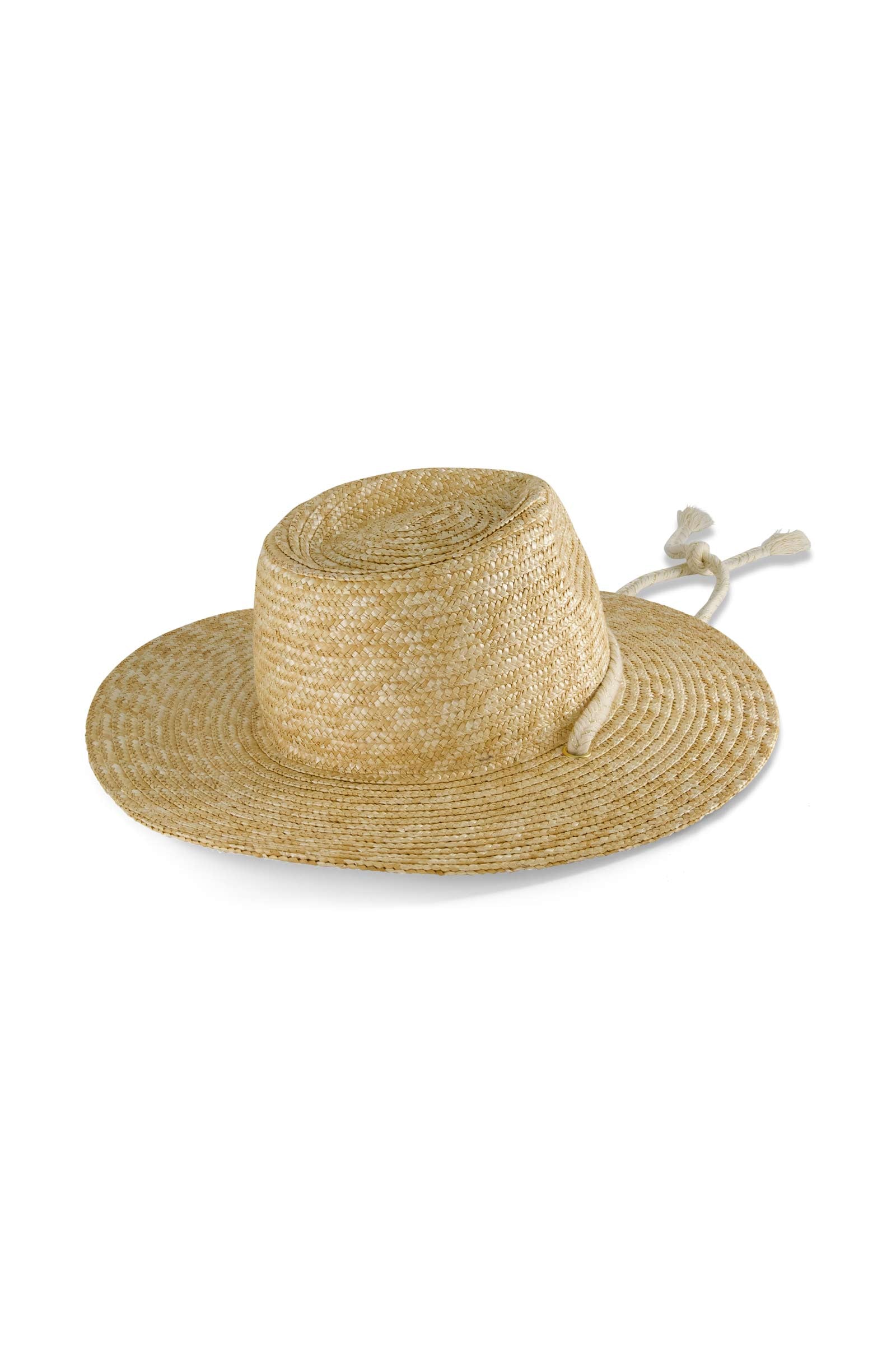 - Hatband: braided natural rope band woven with shimmering gold lurex thread