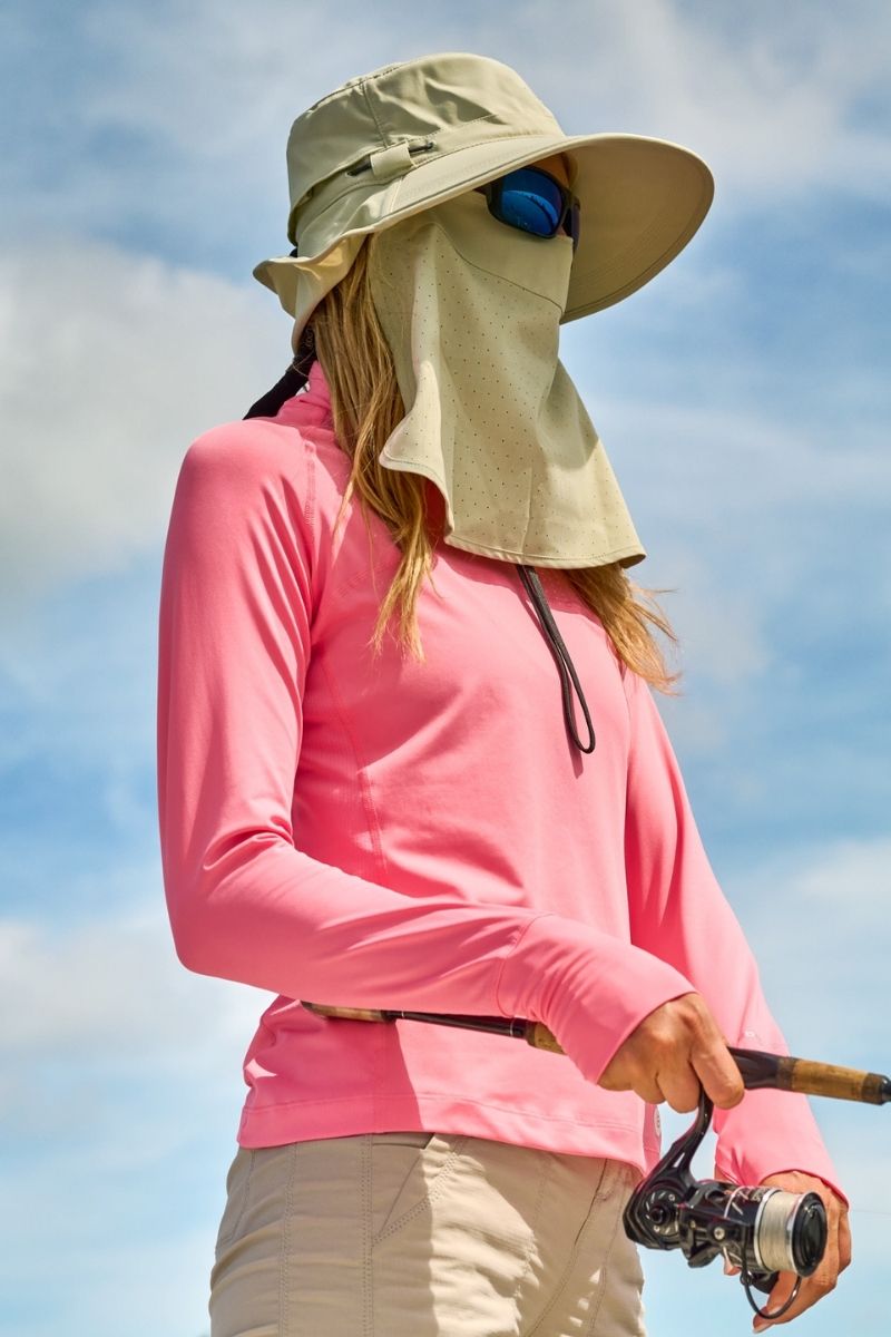 Our packable Stevie Ultra Sun Hat offers customized protection with a roll-up neck drape and a removable face gaiter. Designed for fishing, boating, paddling, hiking, and enjoying the outdoors without worrying about the sun, you can rely on Coolibar's full-coverage sun protection with the Stevie Ultra Sun Hat.