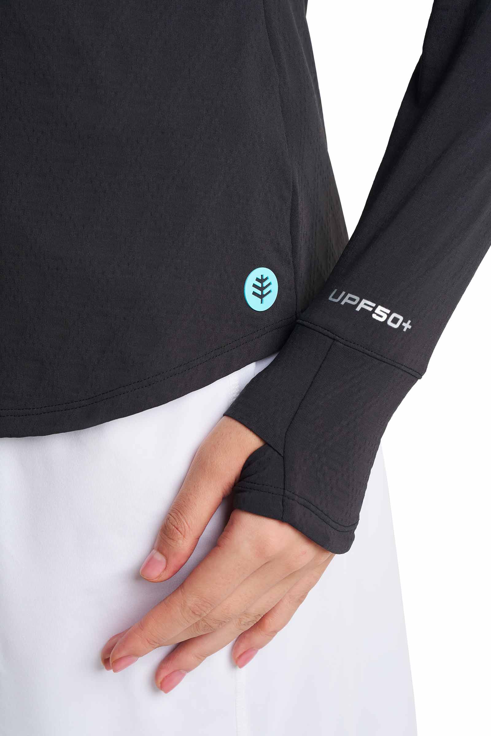 - Coolibar logo on upper back, UPF 50+ on left cuff
