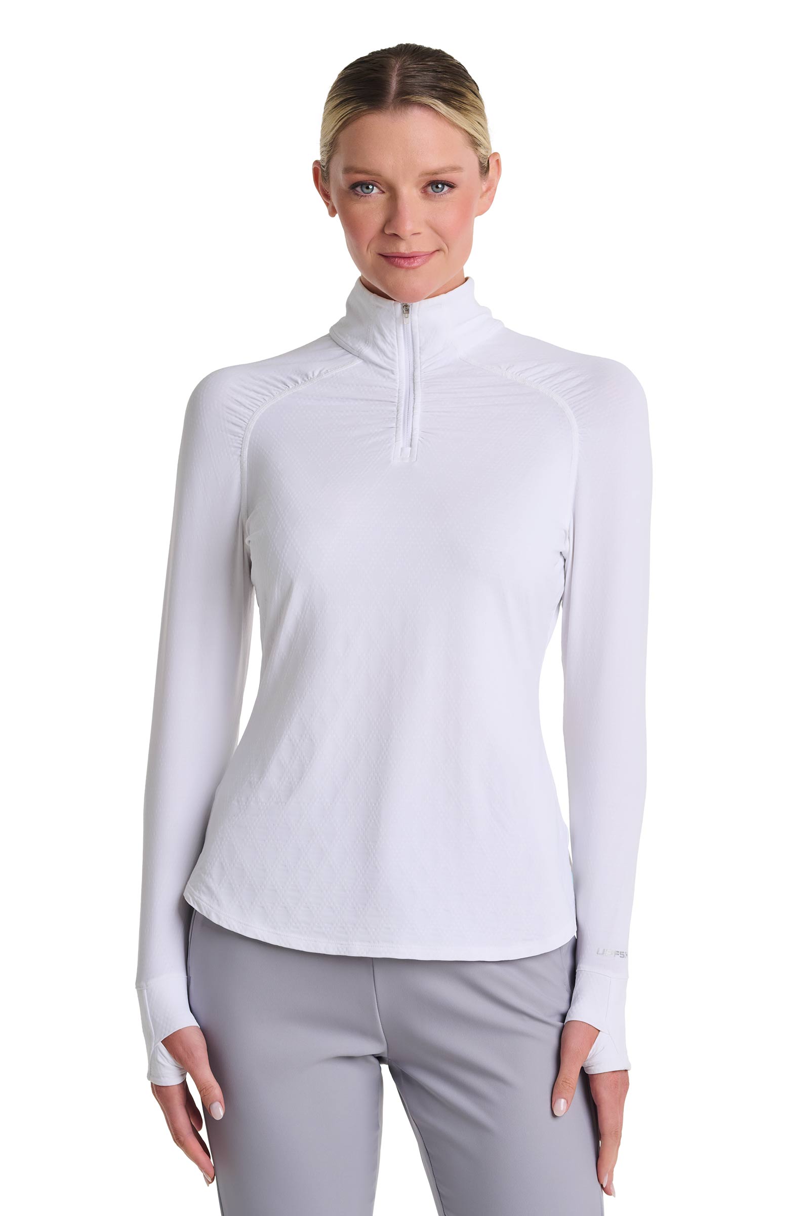 The Arabella Quarter-Zip features the beautiful, light jacquard knit diamond texture of our Active Diamond™ fabric. The soft detailing of the stitching amplifies the flattering ruching on the shoulders and along the zipper of this fitness quarter-zip. The UPF 50+ coverage extends even further with the stand-up collar and unique hem that curves perfectly along the top of the hand.