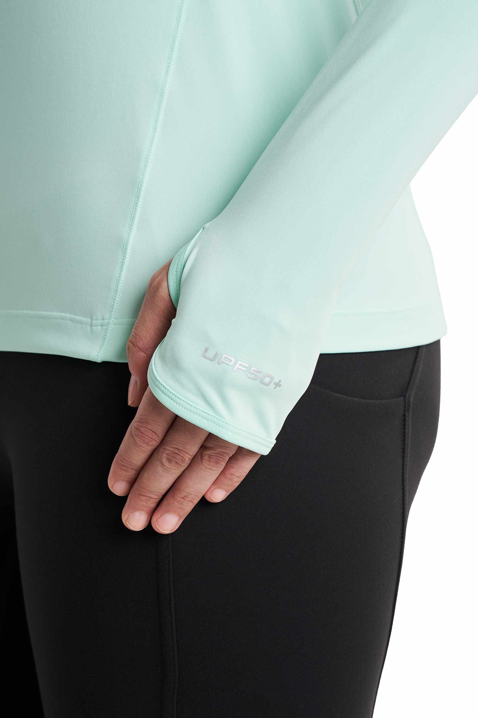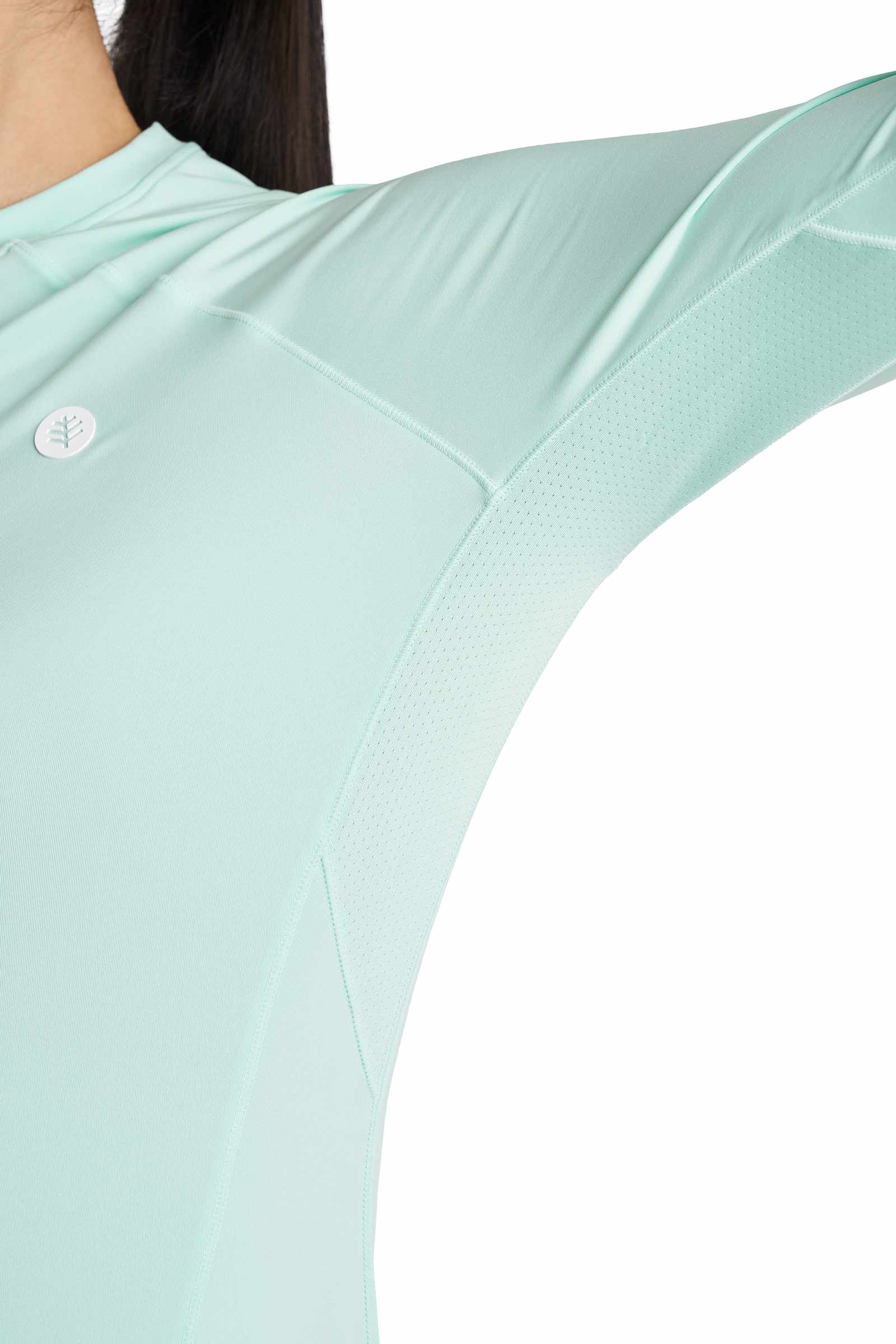 - Coolibar logo on upper back, UPF 50+ on left cuff