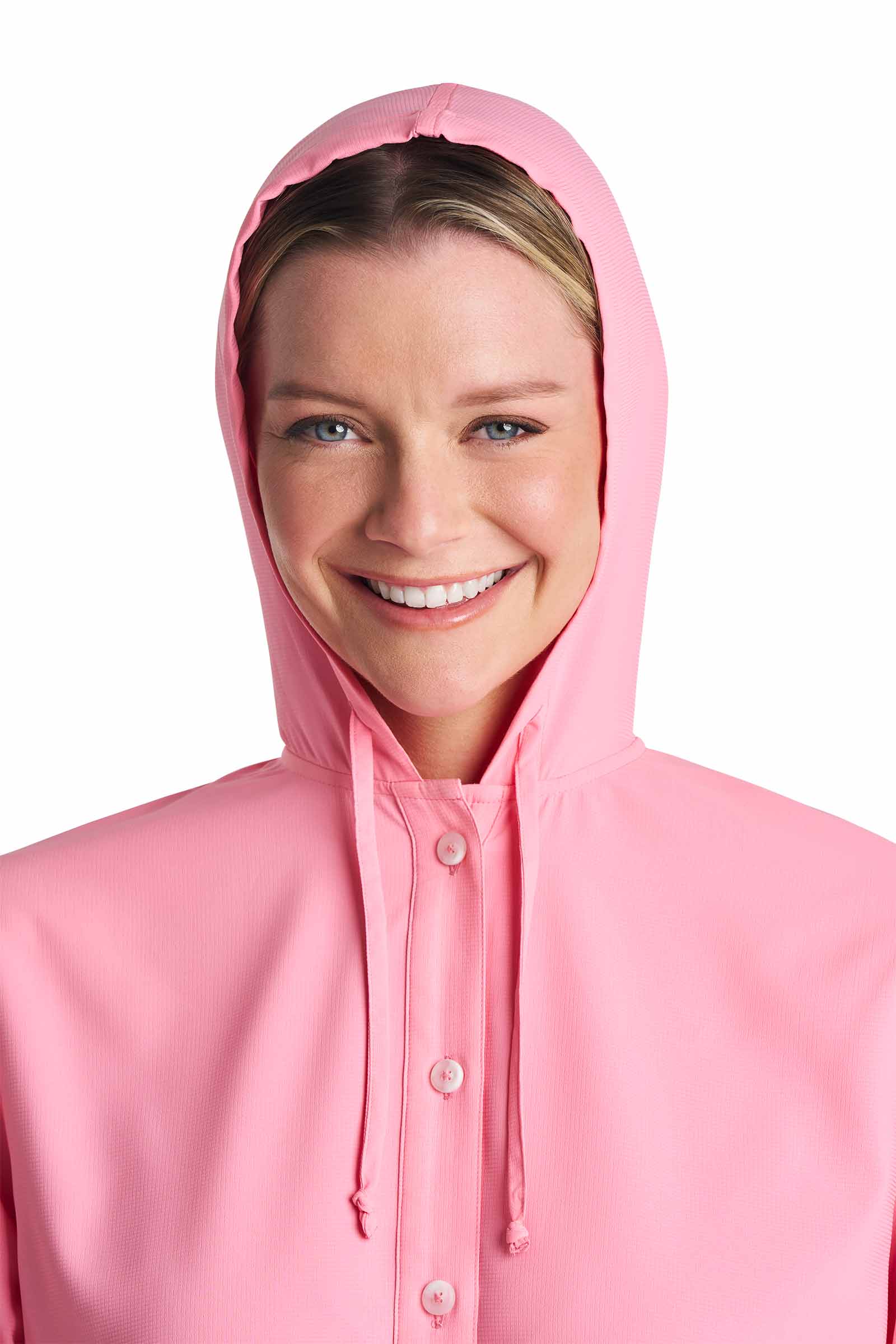 Elegant drawstring hood protects face and neck