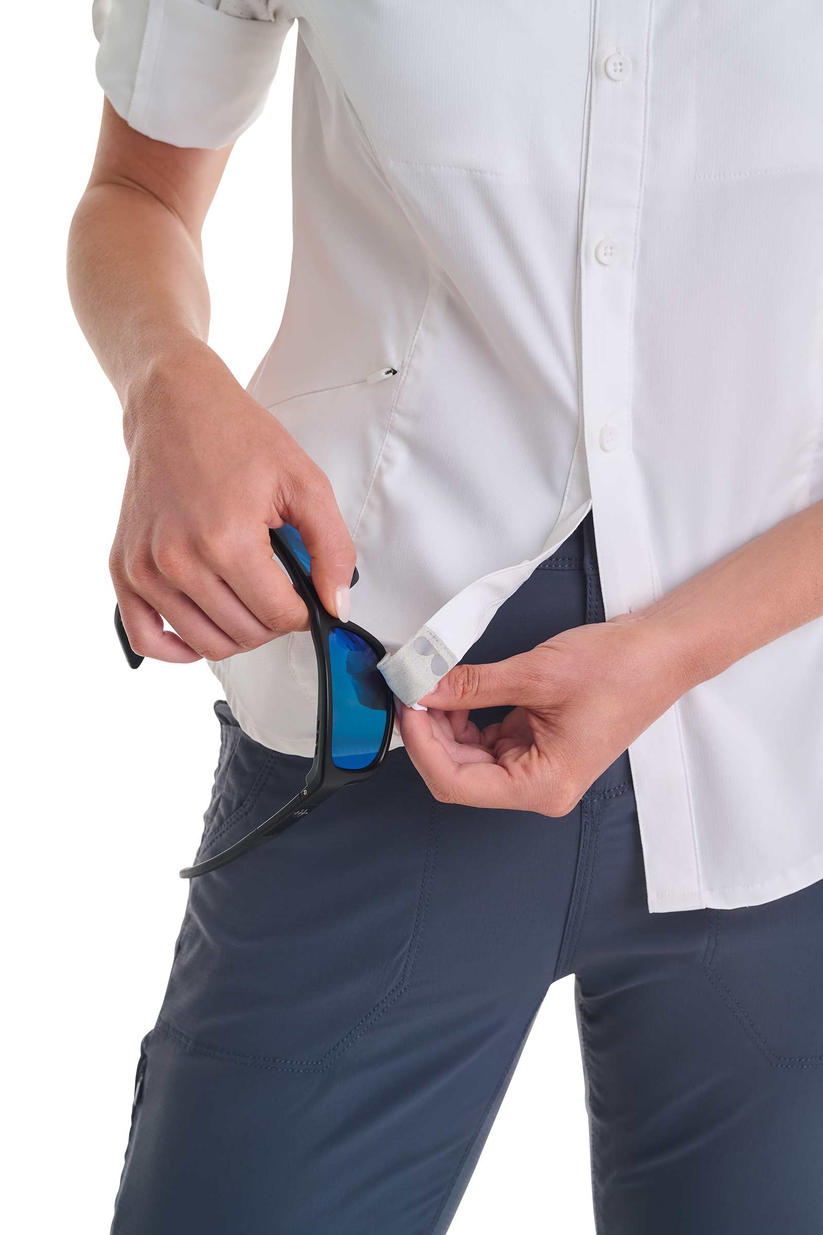- Microfiber sunglasses patch at bottom of placket