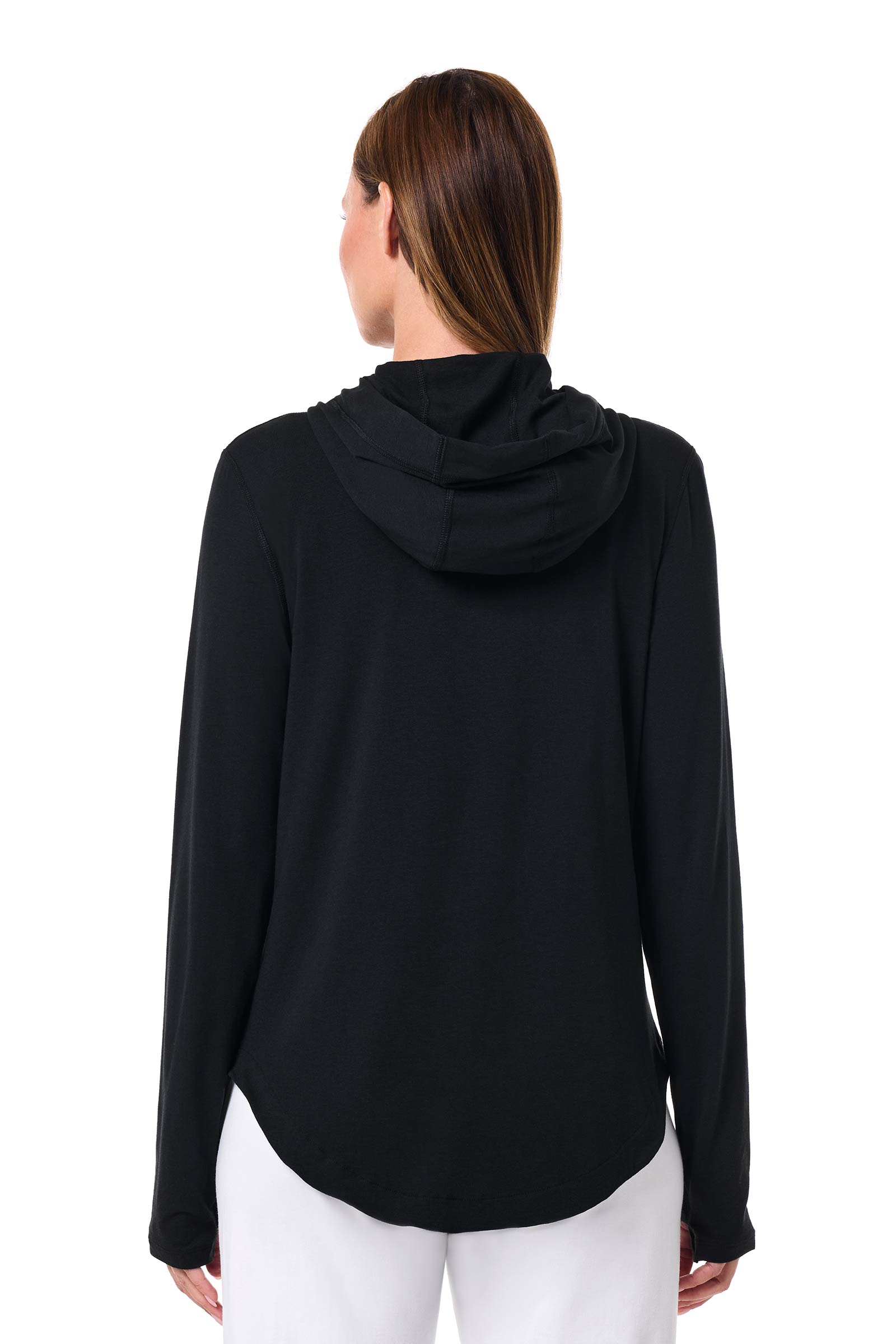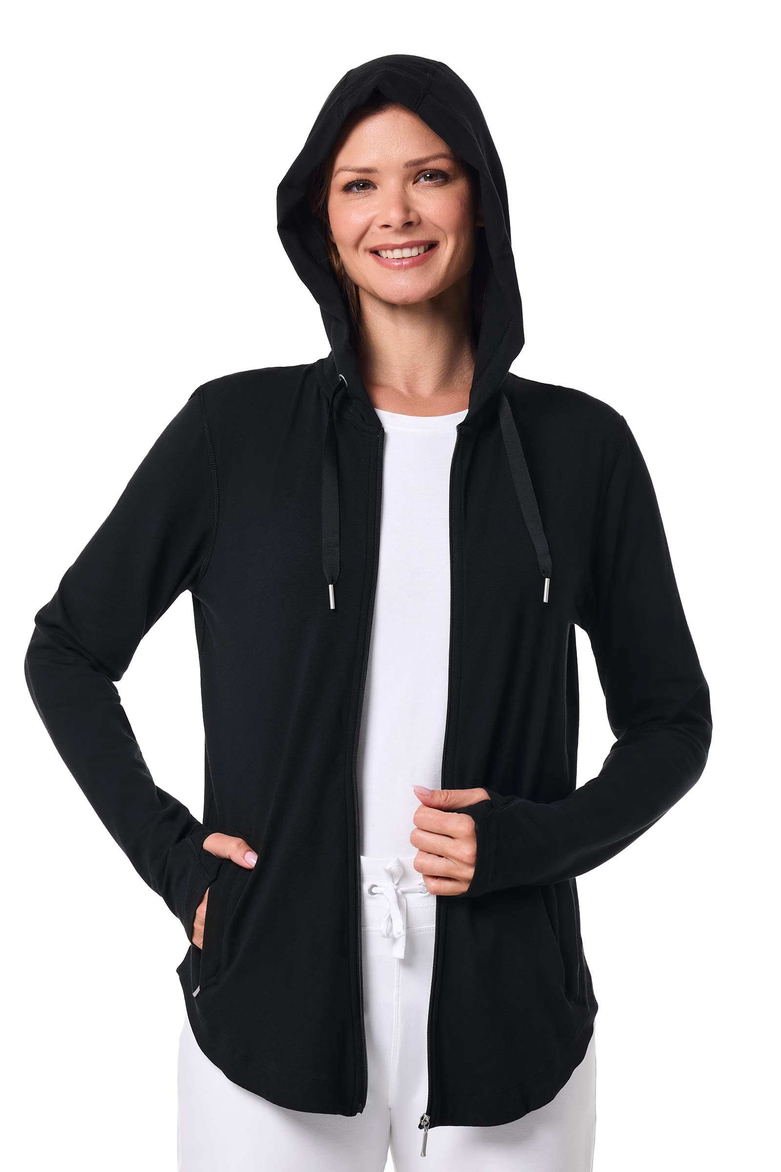 The Lumaleo Zip-Up Hoodie is a lightweight layering piece with thumb holes, designed for everyday sun protection and comfort. This versatile athleisure hoodie is perfect for walking the dog, running errands, or enjoying any casual outdoor activity