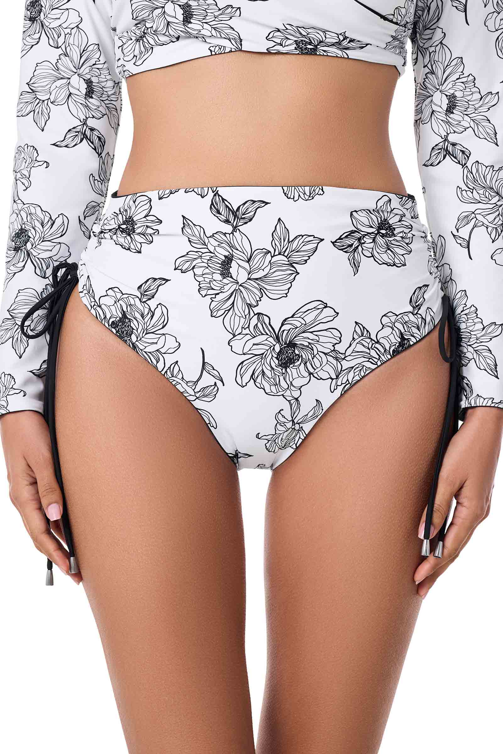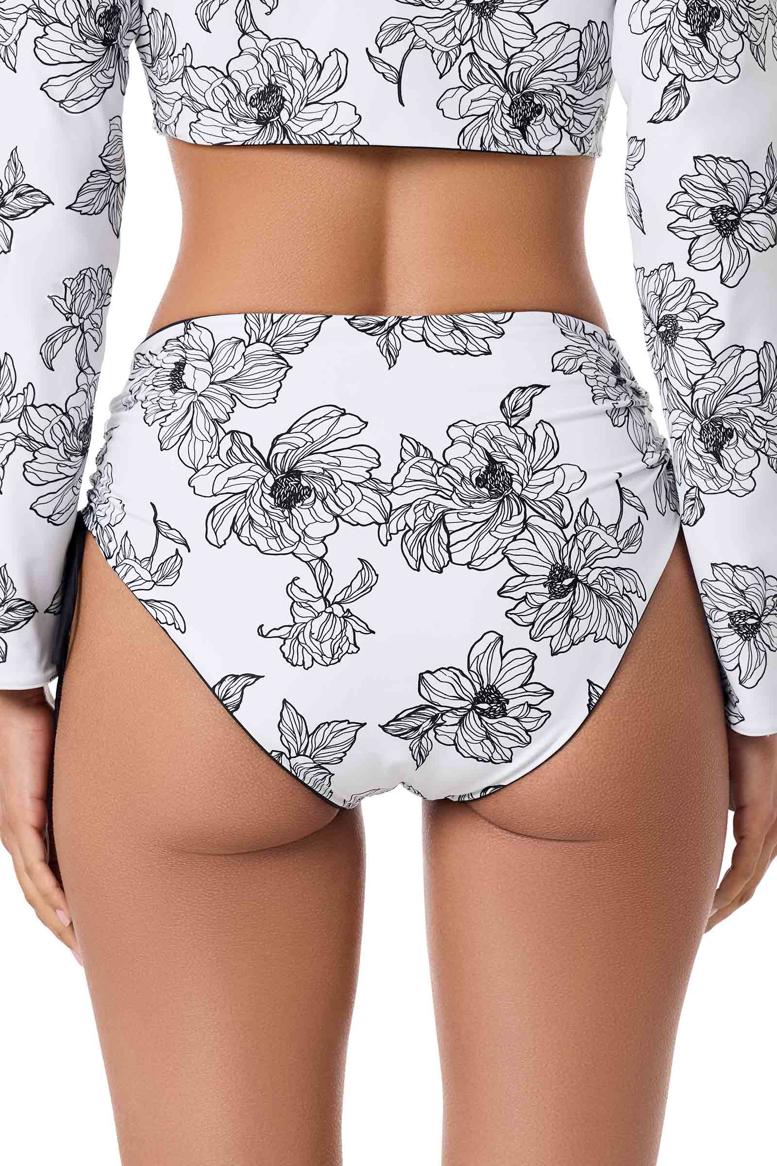 Women's Myrtle Reversible Ruche Adjustable Swim Bottoms | White/Black Perfect Peony
